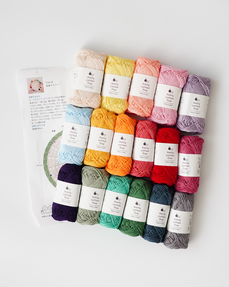 ・糸:アミティコットンファイン(25g玉巻き)/生成(102)、緑(1009)、イエロー(103)、オレンジ(104)、ピンク(105)、ラベンダー(106)、水色(107)、マスタード(1001)、マンダリンオレンジ(1002)、ポピーレッド(1003)、赤(1004)、ラズベリー(1005)、パープル(1006)、セージグリーン(1007)、ミント(1008)、ダスティブルー(1010)、グレー(1011)…各1玉