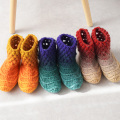 「SLIPPERS」という糸は1玉で左右同じカラーのルームシューズが編めるという画期的な商品。染色が得意なイタリアメーカーならではの技ですね。珍しい商品で編むのも楽しいのでぜひ一度お手に取ってみてください。