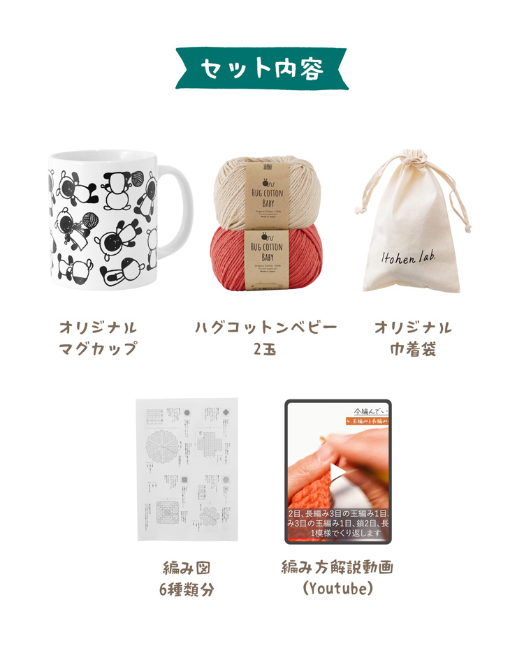 セットにした糸「ハグコットンベビー」は、環境や使う人への優しさを「ハグ(抱きしめる)」という名前に込めた、オーガニックコットン100%の糸です。国内の安全基準を満たした染料で染め上げているので、どなたでも安心して手に取っていただける素材です。