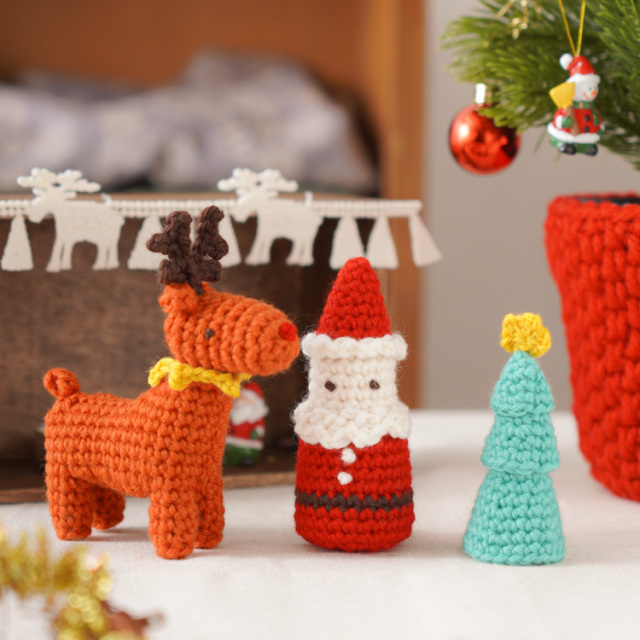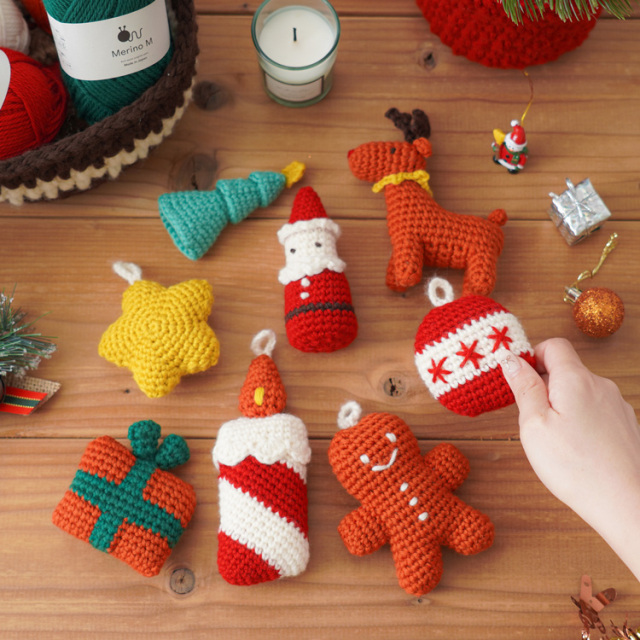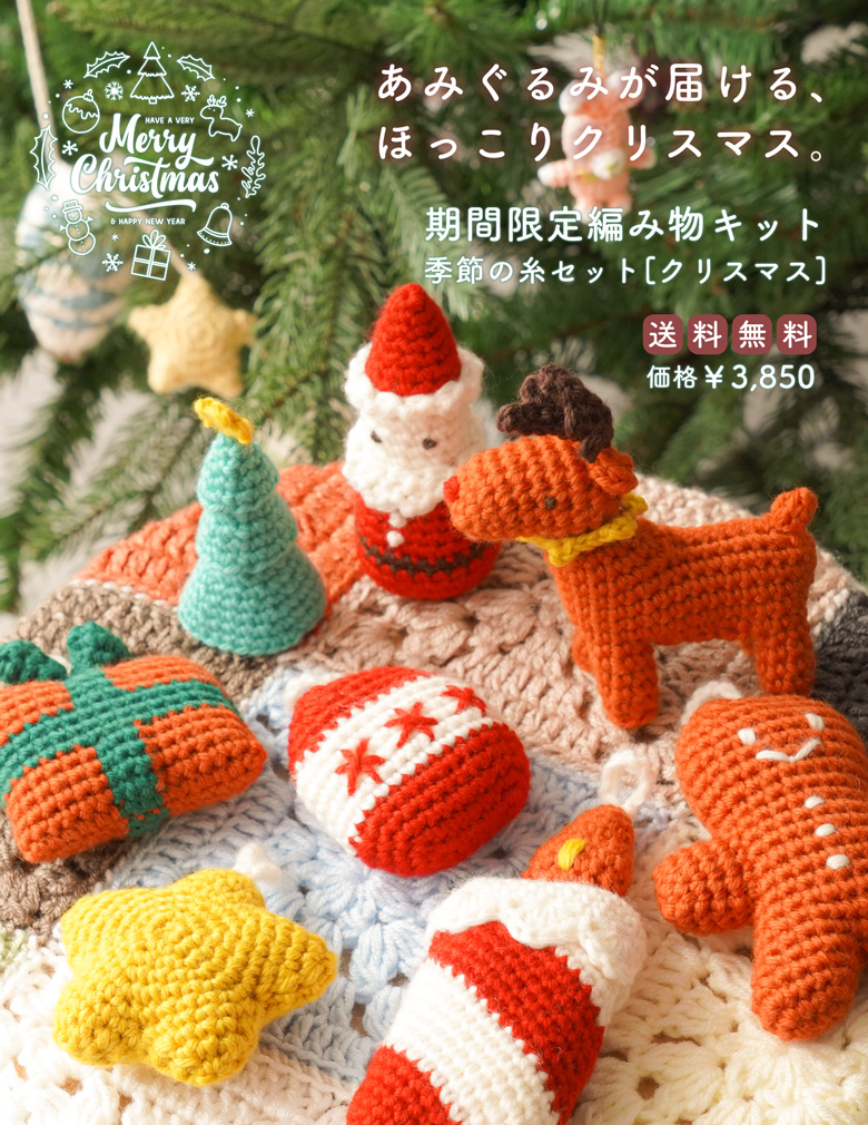 手のひらサイズの「サンタクロース」「トナカイ」「ツリー」「オーナメント5種」が編める、期間限定のあみぐるみキットです。