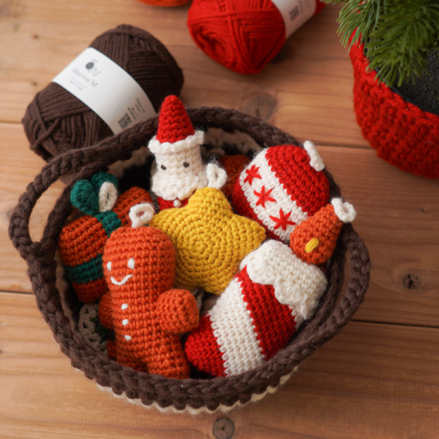 こちらはキットには含まれませんが、「チャティアクリル極太」で編んだミニバスケットに入れて飾るだけで、ぐっとクリスマス気分が高まりますね。