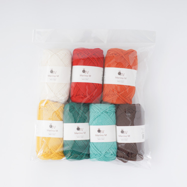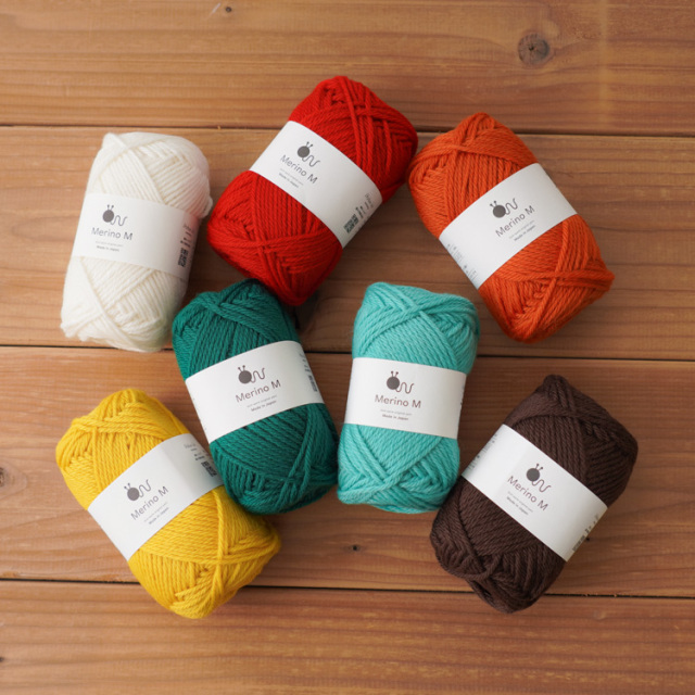 キットには、やわらかな「メリノM」を使用。繊維が細く、チクチクしないやさしい肌ざわりが特徴です。かぎ針にも棒針にも編みやすい並太タイプで、ほどよいふくらみ感があり、手編みにぴったり。発色の良いカラフルな色合いも魅力です。