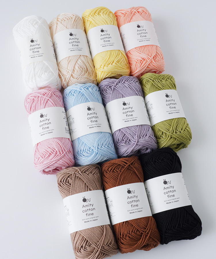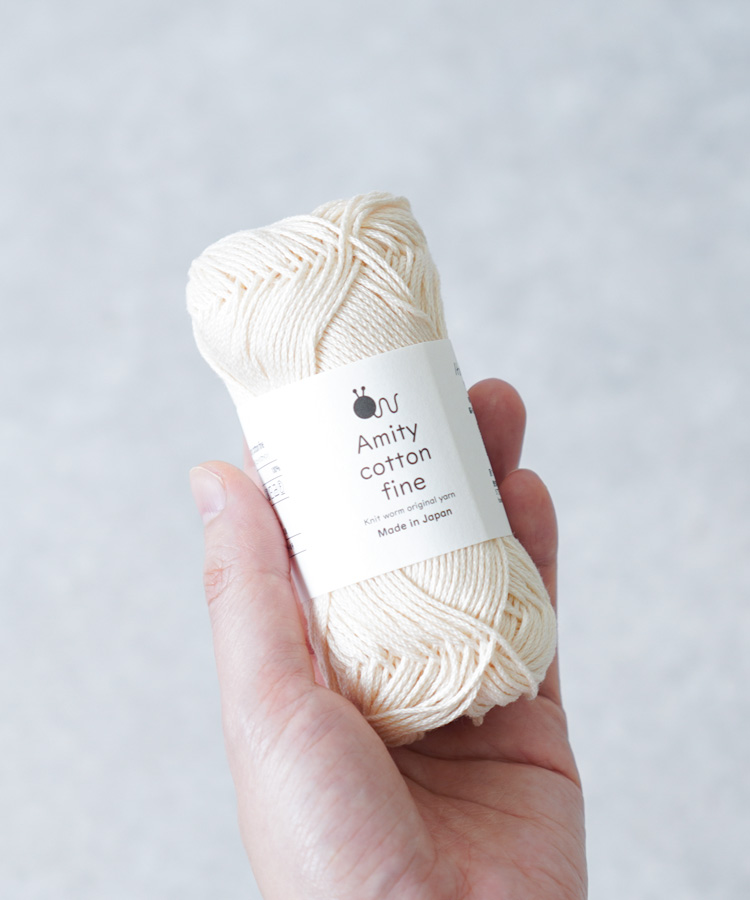 コットン100%の中細タイプで、シルケット加工による上品な光沢感が特徴の糸「アミティコットンファイン」です。繊細なレース模様もきれいに編み上がり、さらっとした触り心地で指通りもなめらか。