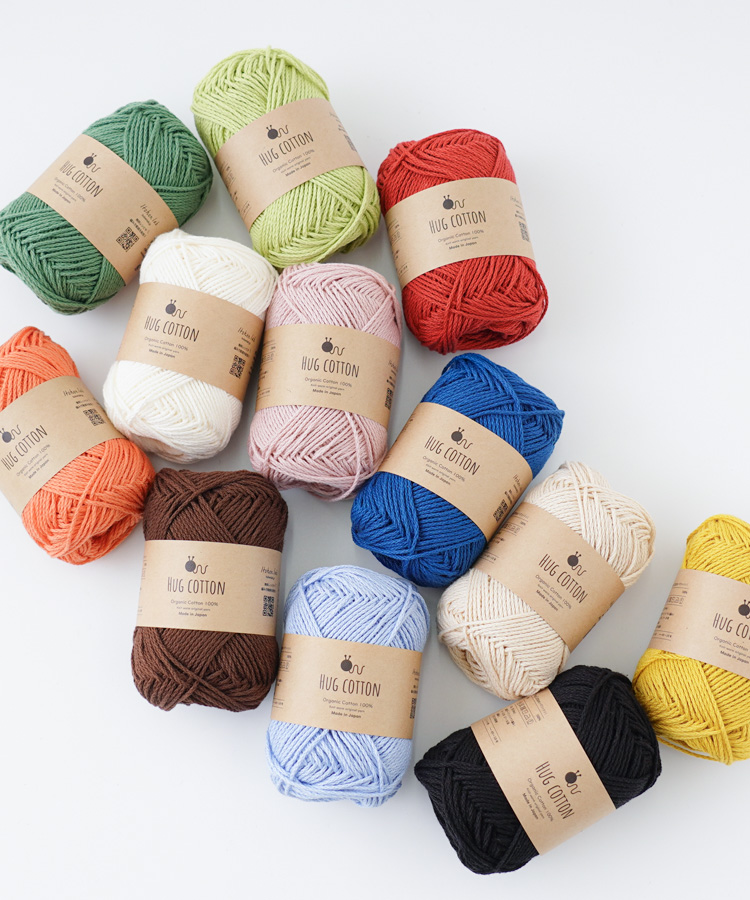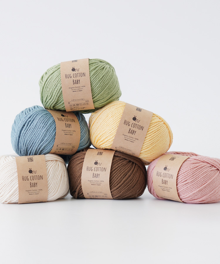 「ハグコットンベビー」は、地球にも、編む人にも、使う人にもやさしいオーガニックコットン糸。そのやさしさを「ハグ=抱きしめる」という名前に込めました。