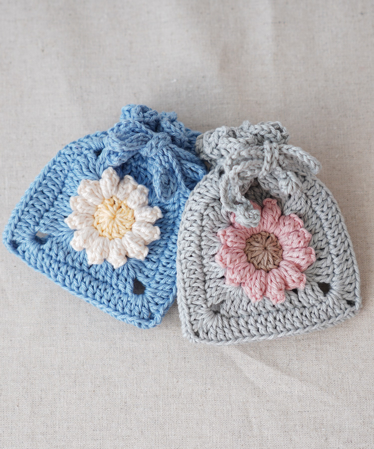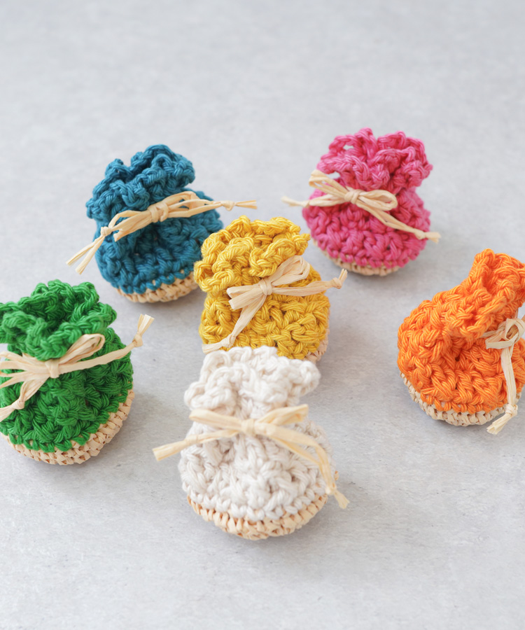 写真のようなカラフルなミニ巾着づくりにもぴったりのコットン糸です。