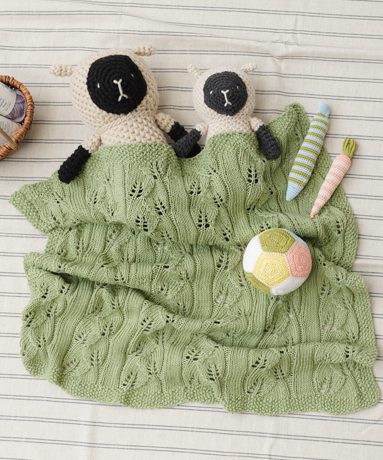 こちらは弊社スタッフが若草色で編んだおくるみ!編み柄も分かりやすく出るのでナチュラルカラーでも存在感のある作品に仕上がりに♪