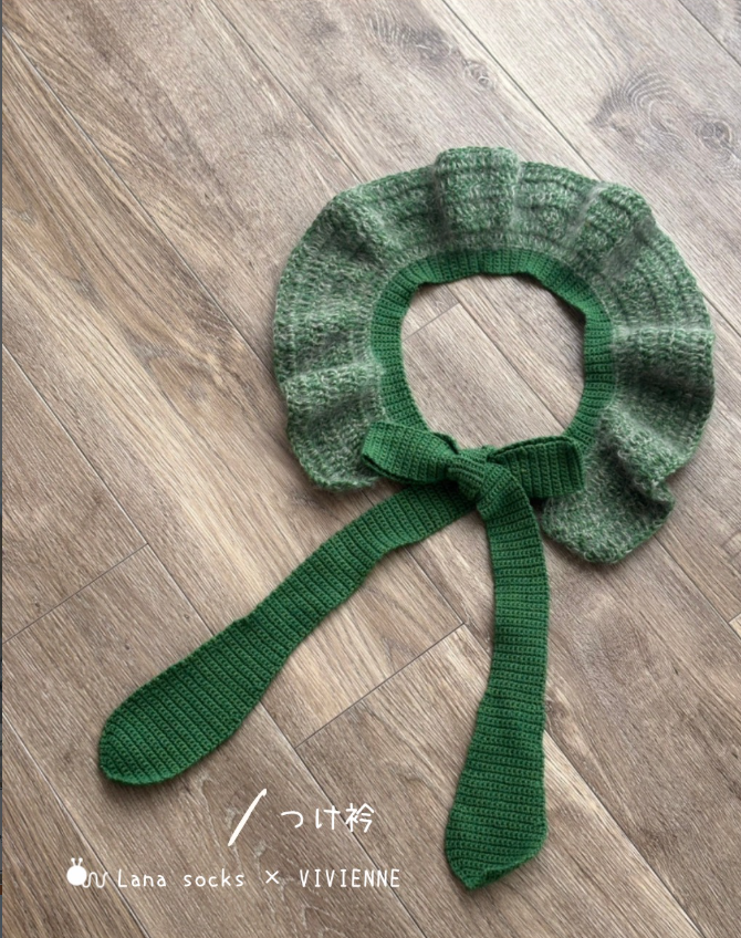 本の中で衿部分はモヘアの糸を使用してるのですが、Knit wormでかぎ針で編めるモヘアは現在販売しておらず、極細モヘアの「VIVIENNE」と「Lana Socks」を引き揃えて編んでいました!