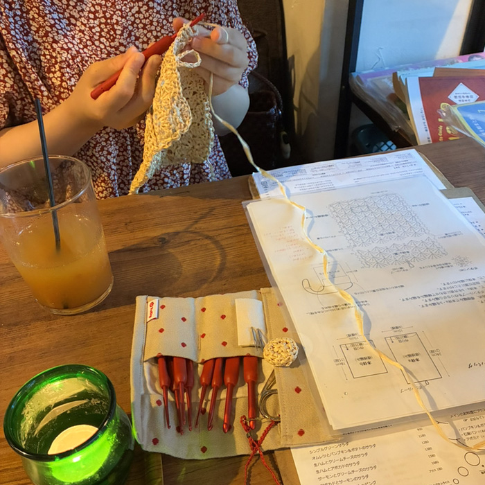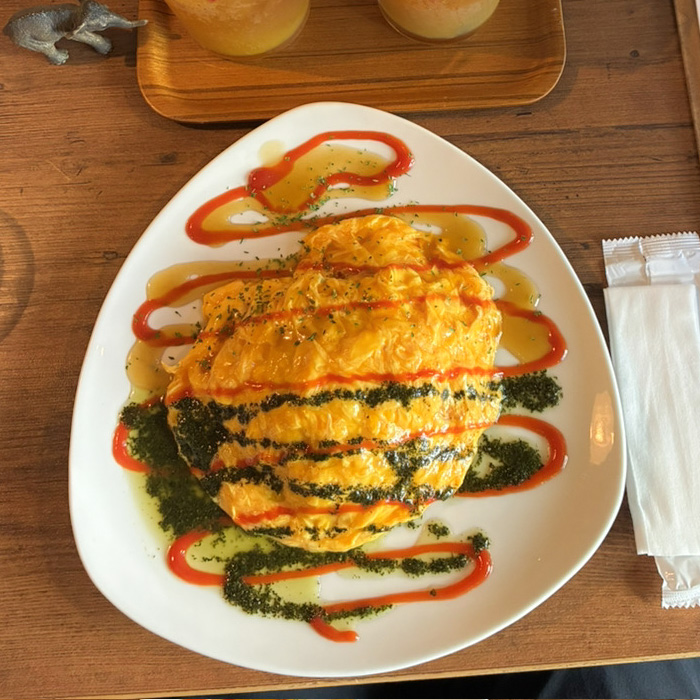 田原は柚子胡椒ソースの変わり種オムライスを、 友人はミルフィーユをいただきました。 伝票が動物の置物で遊び心も満点なカフェでした。 編み物初挑戦の友人を見守りながらゆったりとした時間を過ごしました。