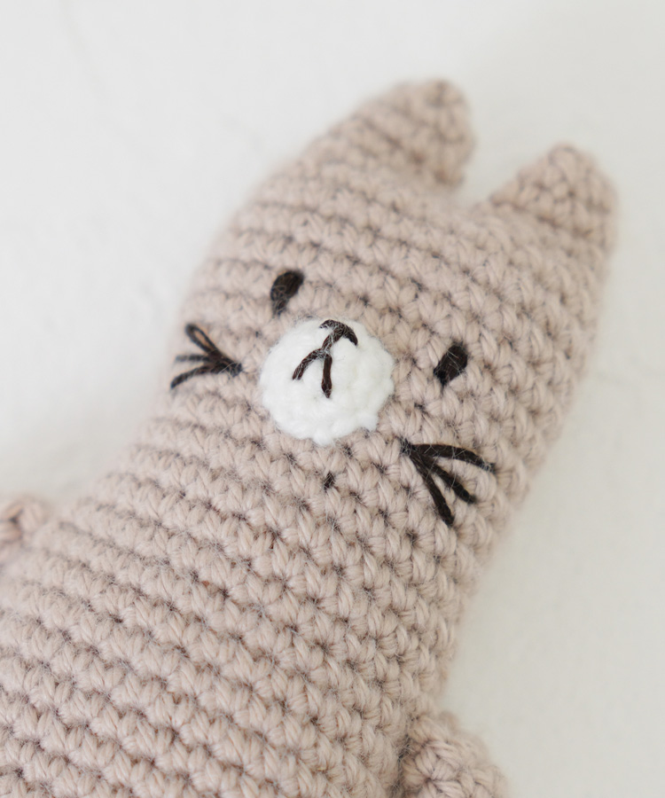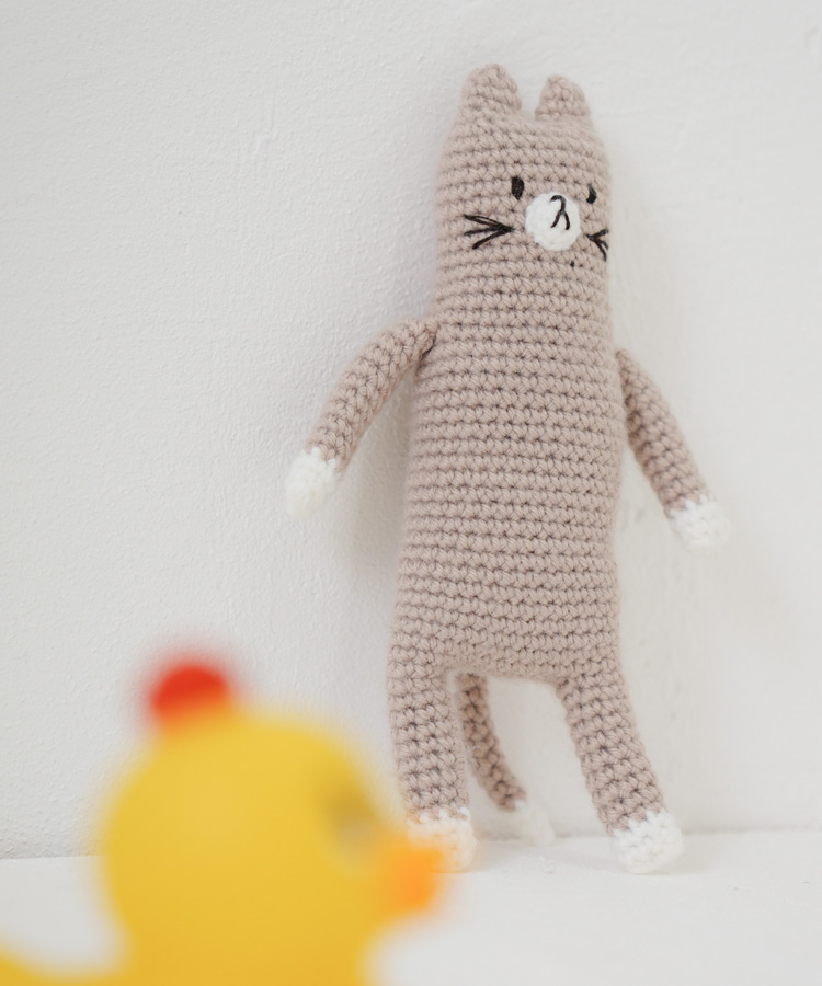 直立不動の、まっすぐな姿がなんともかわいいネコさんのあみぐるみキット。こちらもミドリノクマさんの作品です。手のひらに収まる小さめサイズで、赤ちゃんの小さな手でもにぎにぎしやすい大きさ。やわらかな触り心地なので、思わず握っていたくなるようなやさしい感触が魅力です。