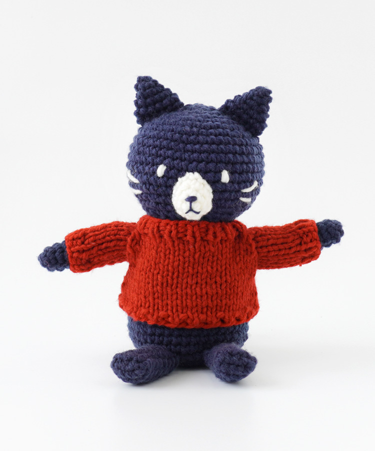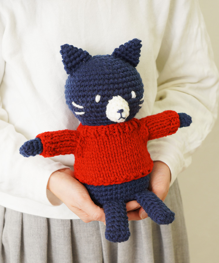 真っ赤なセーターを着た姿が印象的な、かわいいネコちゃんのあみぐるみキットです。こちらのセーターは着脱可能なので、気分に合わせて違う色のセーターを着せ替えて楽しむこともできますよ。