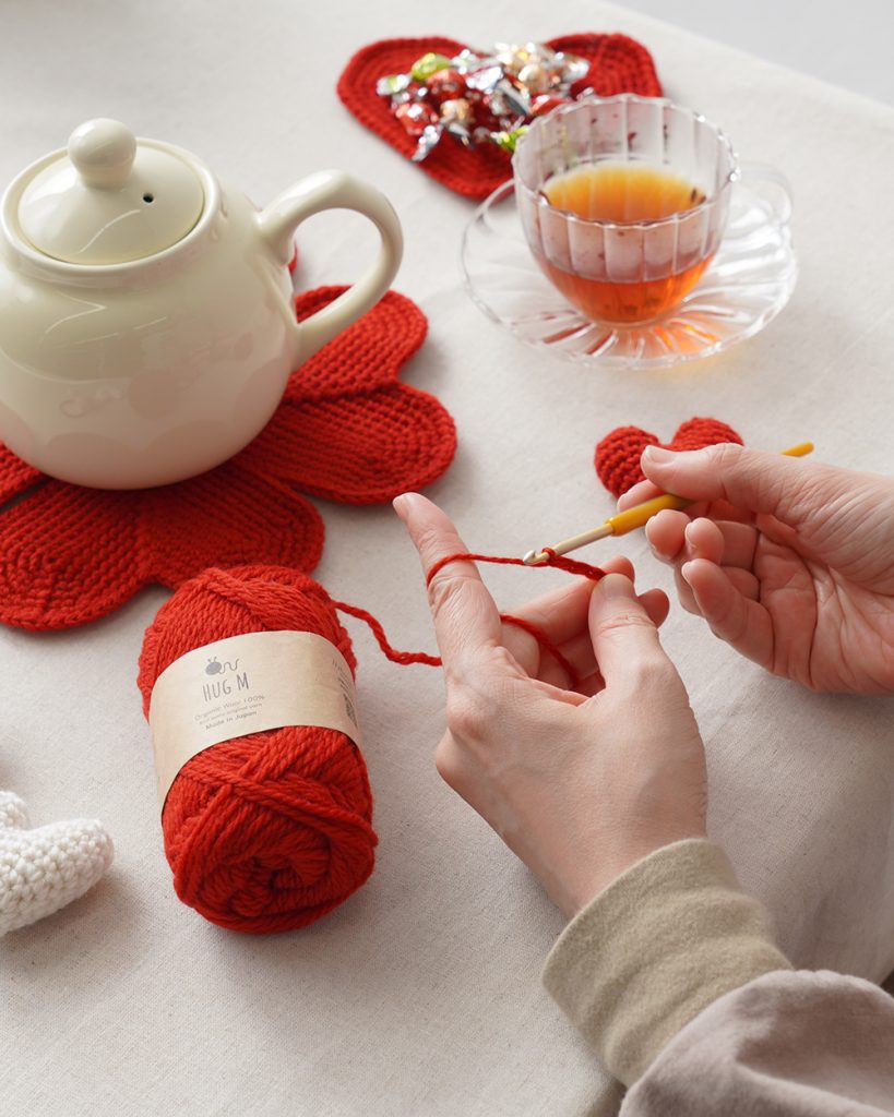 赤だけでなく、グリーンで編むと四葉のクローバーのようになって、とても可愛いですよ。