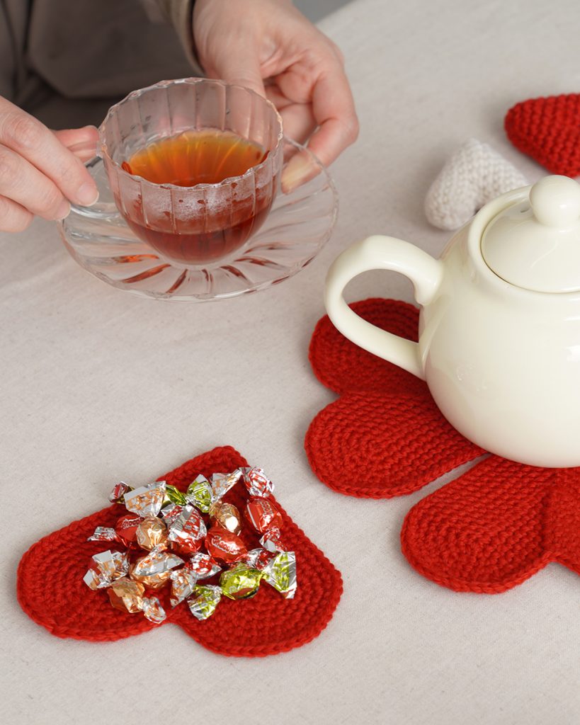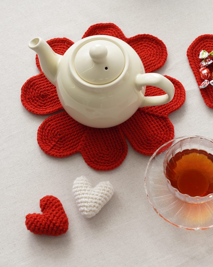 ハートのモチーフは、目数が増えたり減ったりするため、最初は少し慎重になりますが、慣れてくると楽しく編んでいただける作品です。