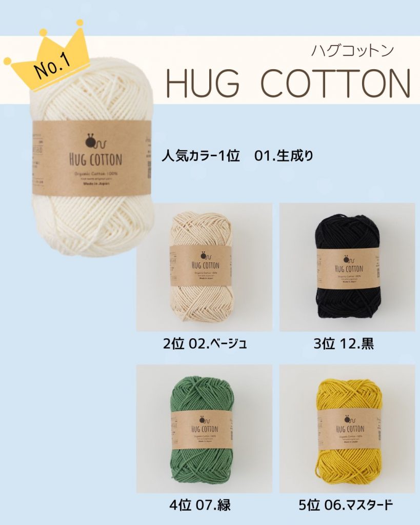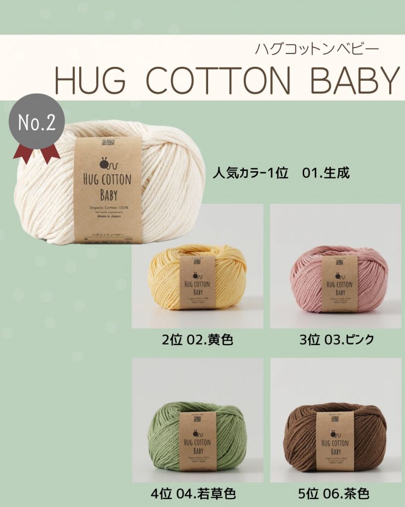 ふんわり柔らかな風合いが編んでいてほっこりするハグコットンベビーが昨年の4位からこちらも順位を上げて2位へランクイン✨安心して使用できる素材で、大切な赤ちゃんへ送るニットを編んでいただきたい。そして赤ちゃんを迎える編み物初心者さんにも編みやすい糸を、という思いで開発した糸です。かぎ針編みでも棒針編みでも柔らかい編み時に仕上がります♪