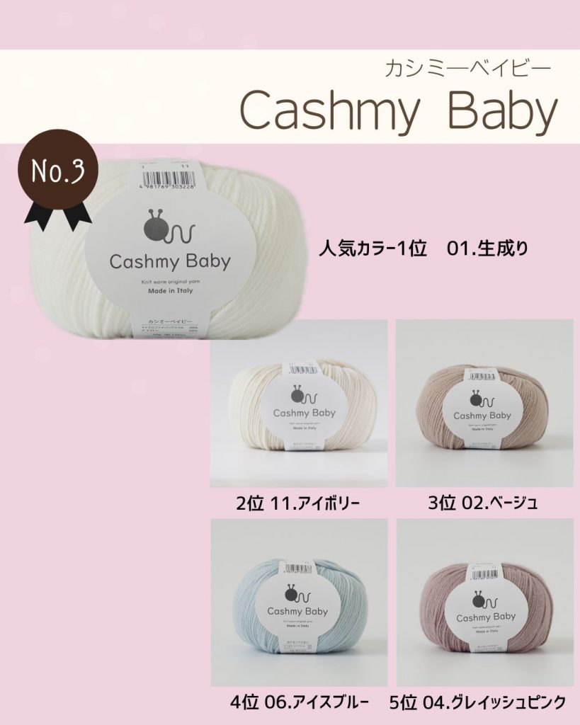 昨年人気No.1に選ばれていたカシミーベイビーがまだまだ人気の3位にランクインしました!商品名の通り、ベビーのおくるみや帽子、シューズなどにぴったりの素材です。ウールを使っていないのでお洗濯も縮みを気にせずにできるのがうれしいポイント💡ベビーアイテムだけでなく、大人用のショールやベストにしても素敵ですよ。まるでカシミヤの風合いは一度手にしたらやみつきです💭