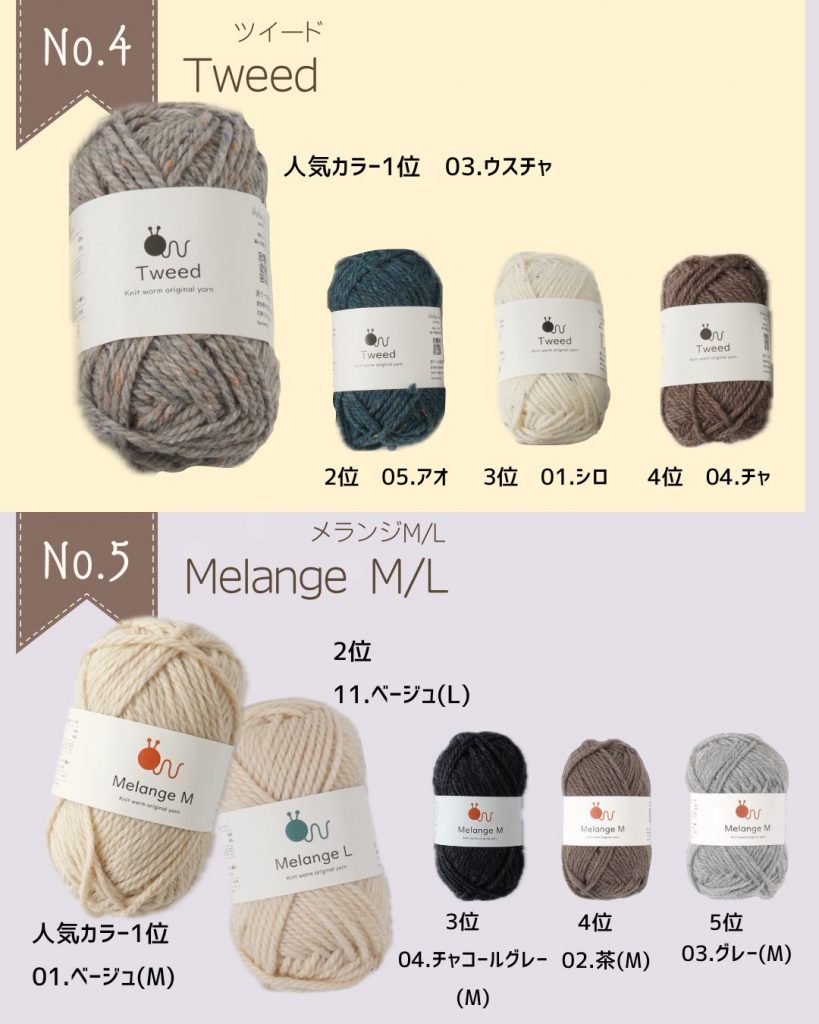 昨年はランク外だったツイードが、じわじわと順位を上げて4位にランクイン✨やさしい色合いのベース糸にネップを混ぜ込んで作った、ツイードタイプの糸はシンプルな編地もオシャレに仕上げてくれます。