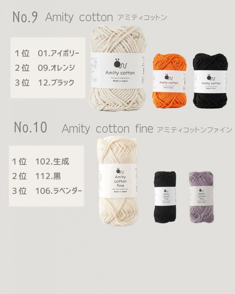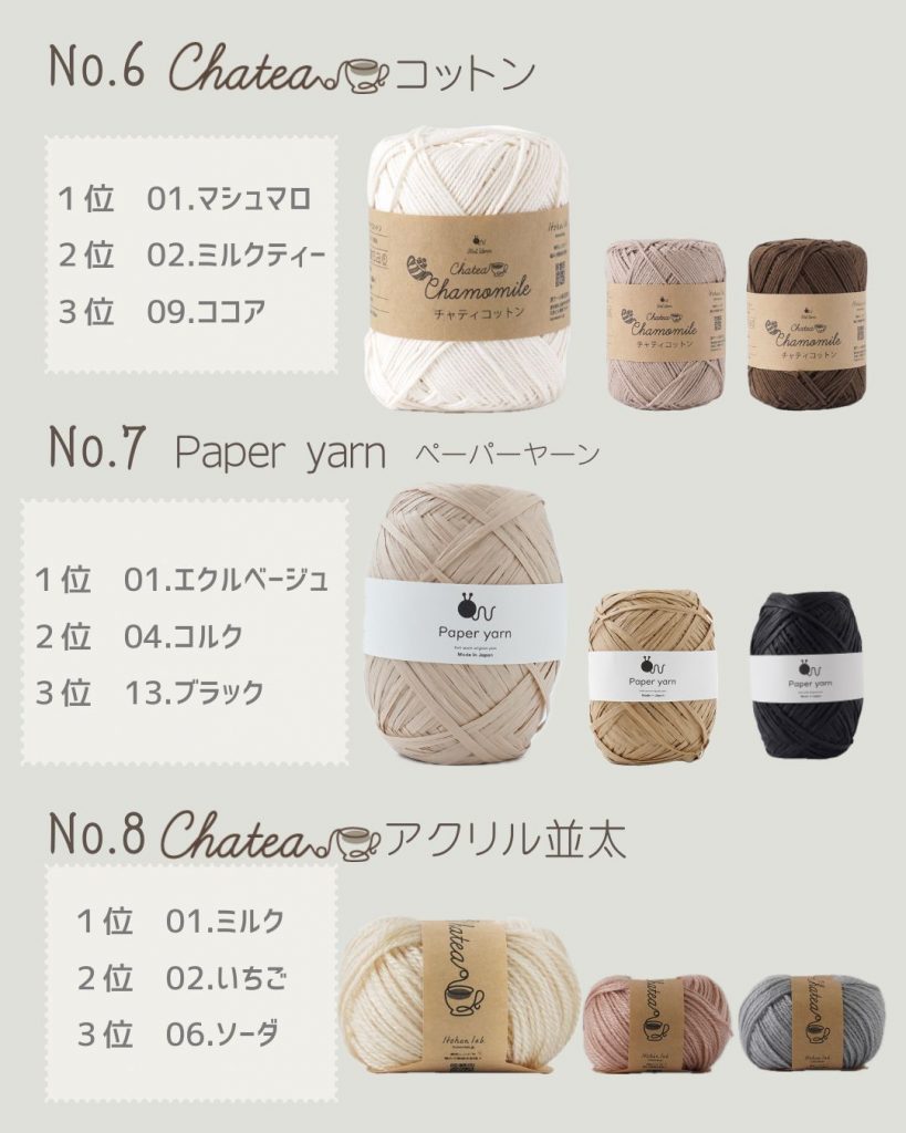 人気ランキング6位 Chateaコットン、7位 ペーパーヤーン、8位 Chateaアクリル並太、9位 アミティコットン、10位 アミティコットンファインという結果になりました。