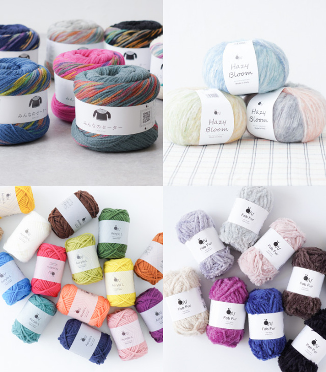 手編み糸(みんなのセーター、ヘイジーブルーム、ファブファー、アクリロなど)、編み物キット、秋冬作品掲載のあみものブックシリーズ