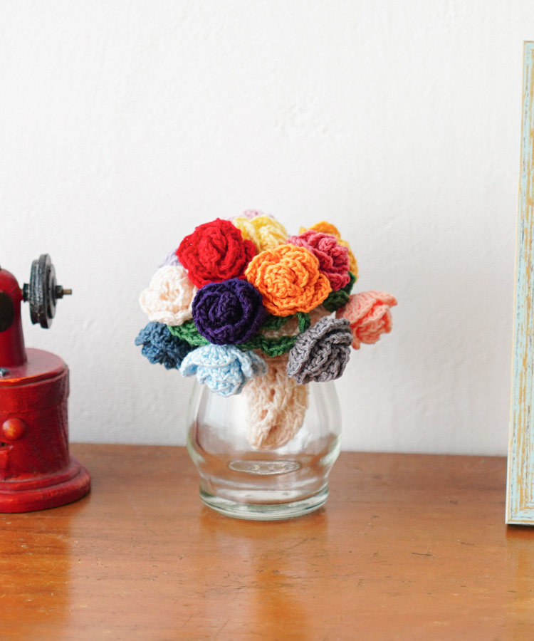 ②小さく楽しむ編み花ブーケ|手編みの花束