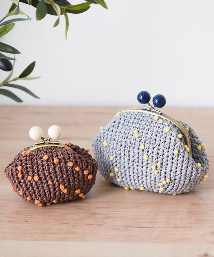 ポンポン付きのペーパーヤーンで編む、かわいらしいがま口ポーチ。