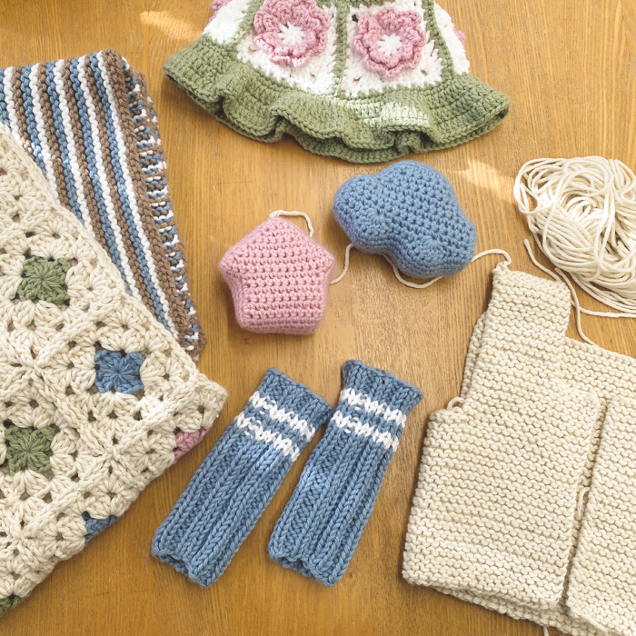 かわいらしいカラーと極太ならではざっくりとした編地がベビー用品にぴったり。作品も続々と仕上がってきていますので、発売をお楽しみに♬