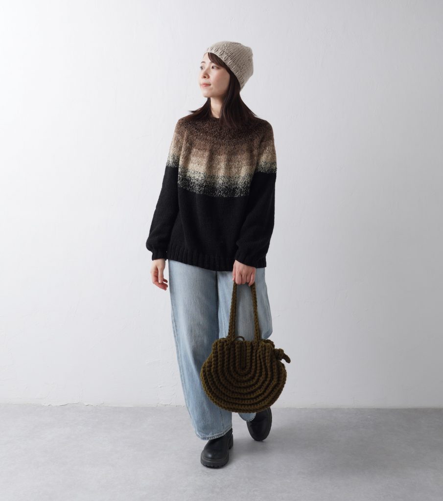 グラデーション部分のカラーに近いベージュのニット帽とも相性抜群です!アクリロXLでざっくり編んだバッグも大容量でとても使いやすいですよ♪